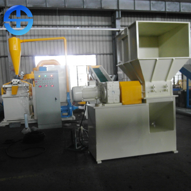 El material es alimentación en la primera trituradora, que destrozan los cables (φ≤25mm) en pedazos de la longitud 10-20m m, después transportan estos pedazos en la segunda trituradora, la segunda trituradora (10 PC que giran las cuchillas, 4 cuchillas fijadas las PC) destrozará los cables en pedazos plásticos de la longitud 3-5m m o reviste pedazos con cobre. Finalmente, bajo fuerza del empuje de la circulación de aire y de vibrar de la pantalla, los pedazos moverán adelante uno la pantalla, el cobre separado del plástico y los mandarán a través de tubo de aire de la succión vibrante.